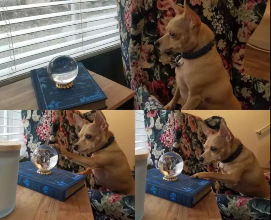主人刚开始不解,回来站到狗狗的角度,他才发现原来通过水晶球可以看见窗户外的人行道,要是看到表现怪异的人,狗砸就会更不得钻进球里去视察......